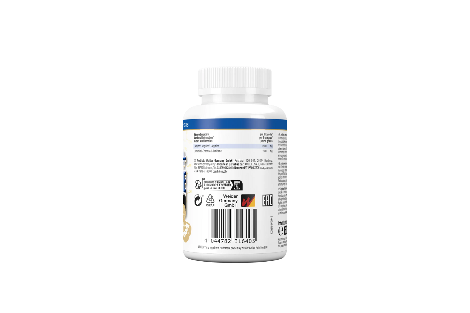 Weider Arginine 2500 mg + Ornithine 1500 mg este un supliment avansat conceput pentru a susține performanța sportivă, pomparea musculară, refacerea și producția naturală de hormoni. Combinația de L-arginină și L-ornitină este folosită de sportivi pentru a optimiza circulația, pentru a sprijini sinteza oxidului nitric (NO) și pentru a contribui la regenerarea organismului în perioadele de antrenamente intense. Formula puternică este ideală pentru cei care urmăresc creșterea forței, o vascularizare mai bună și refacere de calitate.