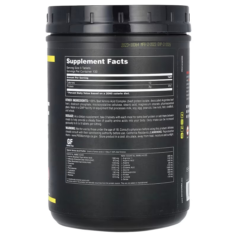 Universal 100% Beef Aminos, 400 tablete este un supliment alimentar pe bază de aminoacizi derivați din proteina de vită hidrolizată, recunoscută pentru calitatea și biodisponibilitatea sa. Fiecare tabletă furnizează un spectru complet de aminoacizi esențiali și neesențiali, contribuind la creșterea și menținerea masei musculare, la recuperarea mai rapidă și la susținerea unui metabolism proteic optim.