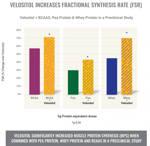 Ingrediente:BCAA 2:1:1, Velositol®, L-lizină, L-fenilalanină, L-treonină, L-histidină, L-metionină, L-triptofan, acid malic, aromă, îndulcitor (sucraloză), colorant (tartrazină).