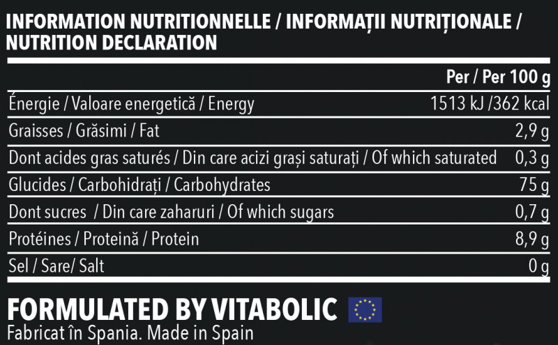 NUTRITION DECLARATION / INFORMAȚII NUTRIȚIONALE / INFORMATION NUTRITIONNELLE Per / Per / Pour 100 g Energy / Valoare energetică / Énergie 1530 kJ /366 kcal Fat / Grăsimi / Graisses 2,7 g Of which saturated / Din care acizi grași saturați / Dont acides gras saturés 0,2 g Carbohydrates / Carbohidrați / Glucides 77 g Of which sugars / Din care zaharuri / Dont sucres 0,3 g Protein / Proteină / Protéines 8,4 g Salt / Sare* / Sel* 0,40 g