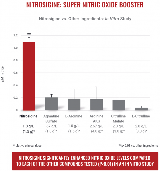 Nitrosigine® este un complex patentat de silicat de arginină legat, unic prin faptul că oferă efecte sinergice puternice. Nitrosigina este un ingredient non-stimulant ce amplifică factorii cheie pentru creșterea fluxului sanguin și crește semnificativ nivelurile de oxid nitric (NO). S-a demonstrat clinic că nitrosigina promovează producția de oxid nitric pentru îmbunătățirea fluxului sanguin, concentrarii, pomparii musculare și a energiei. Peste 30 de studii de cercetare pentru a demonstra siguranta si eficenta sa.