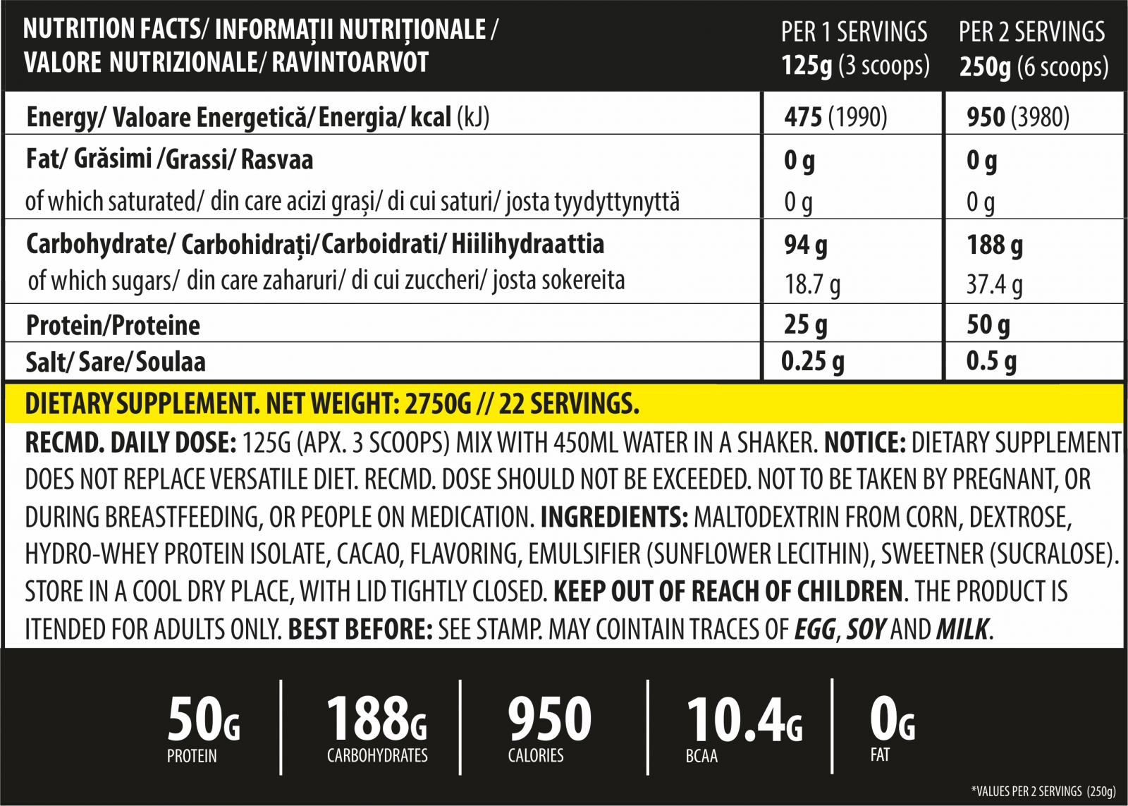 Maltodextrina este un carbohidrat complex obtinut din porumb, cu un lant molecular mai scurt decat alti carbohidrati complecsi. Maltodextrina este formata dintr-un lant de molecule de glucoza usor de asimilat de organism. Este un ingredient perfect atat inainte, cat si dupa antrenament, deoarece contribuie la refacerea rapida a nivelului de glicogen.