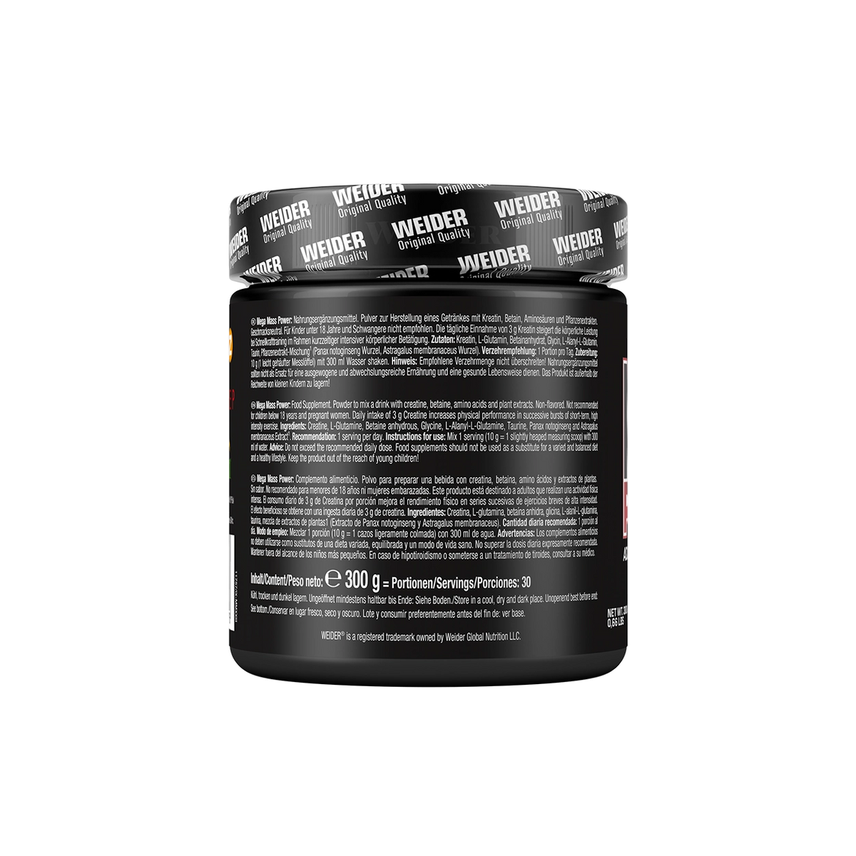 Weider Mega Mass Power este un supliment avansat pe bază de creatină, conceput pentru sportivii care urmăresc creșterea forței, a energiei și a rezistenței în timpul antrenamentelor intense. Formula conține creatină pură CreaZ®, combinată cu ingrediente suport precum L-Glutamină, Betaine, Glicină și Taurină, pentru o eficiență și o absorbție mai bună.