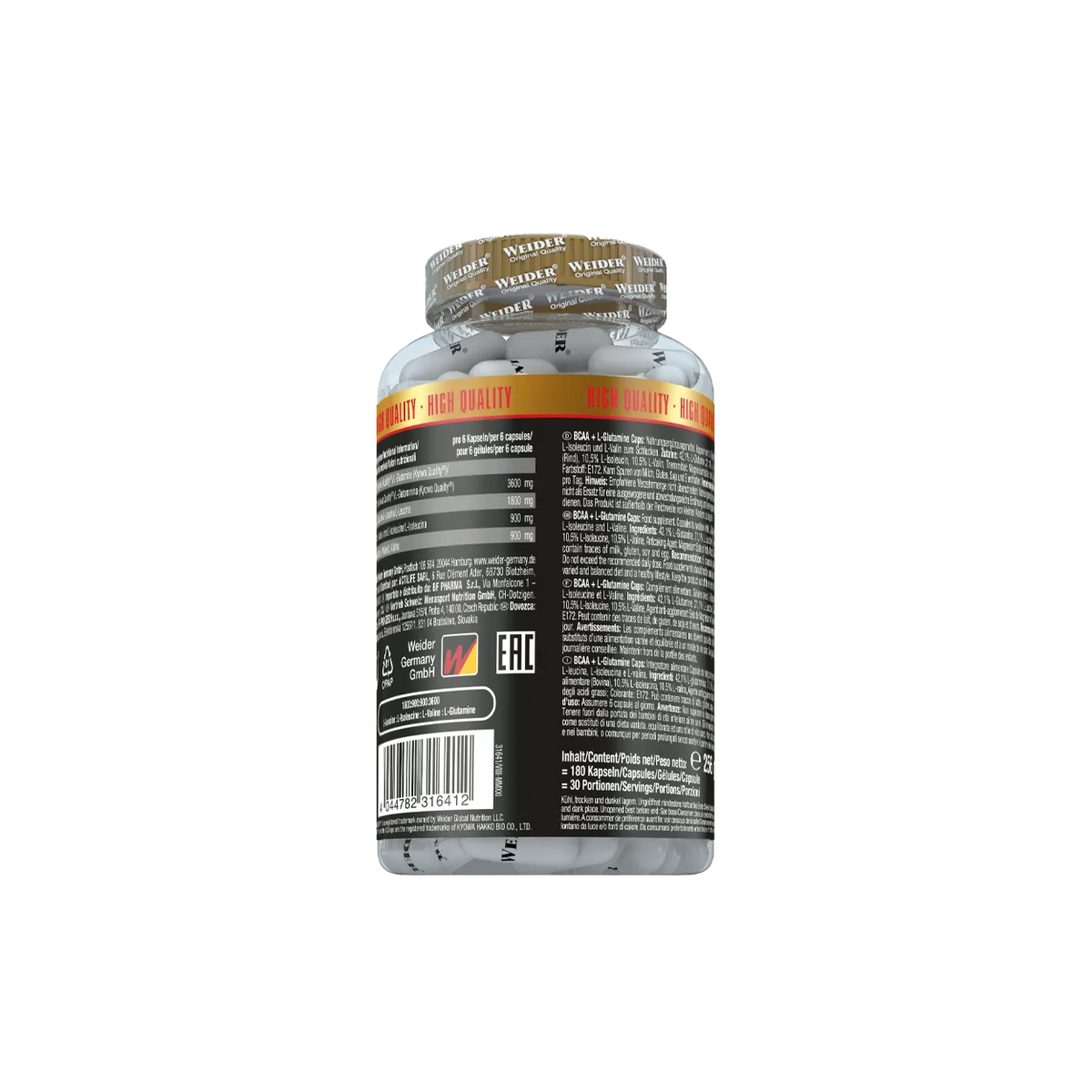 Weider BCAA + L-Glutamine 180 capsule este un complex de aminoacizi esențiali, special formulat pentru a susține recuperarea musculară, protecția țesutului muscular și performanța în antrenamente. Combinația de BCAA (leucină, izoleucină, valină) în raport optim și L-glutamină ajută la reducerea oboselii musculare, prevenirea catabolismului și accelerarea regenerării după efort.