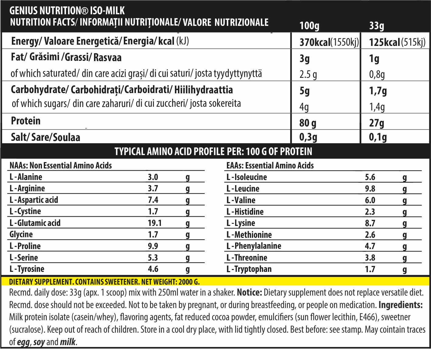ISO-MILK are un continut extrem de scazut de grasimi, carbohidrati sau lactoza, avand in schimb un continut foarte ridicat de aminoacizi si, in special, de BCAA. Este una dintre cele mai pure forme de proteina nu numai pentru ca este recunoscuta ca atare, ci si datorita tehnologiei de filtrare naturala.