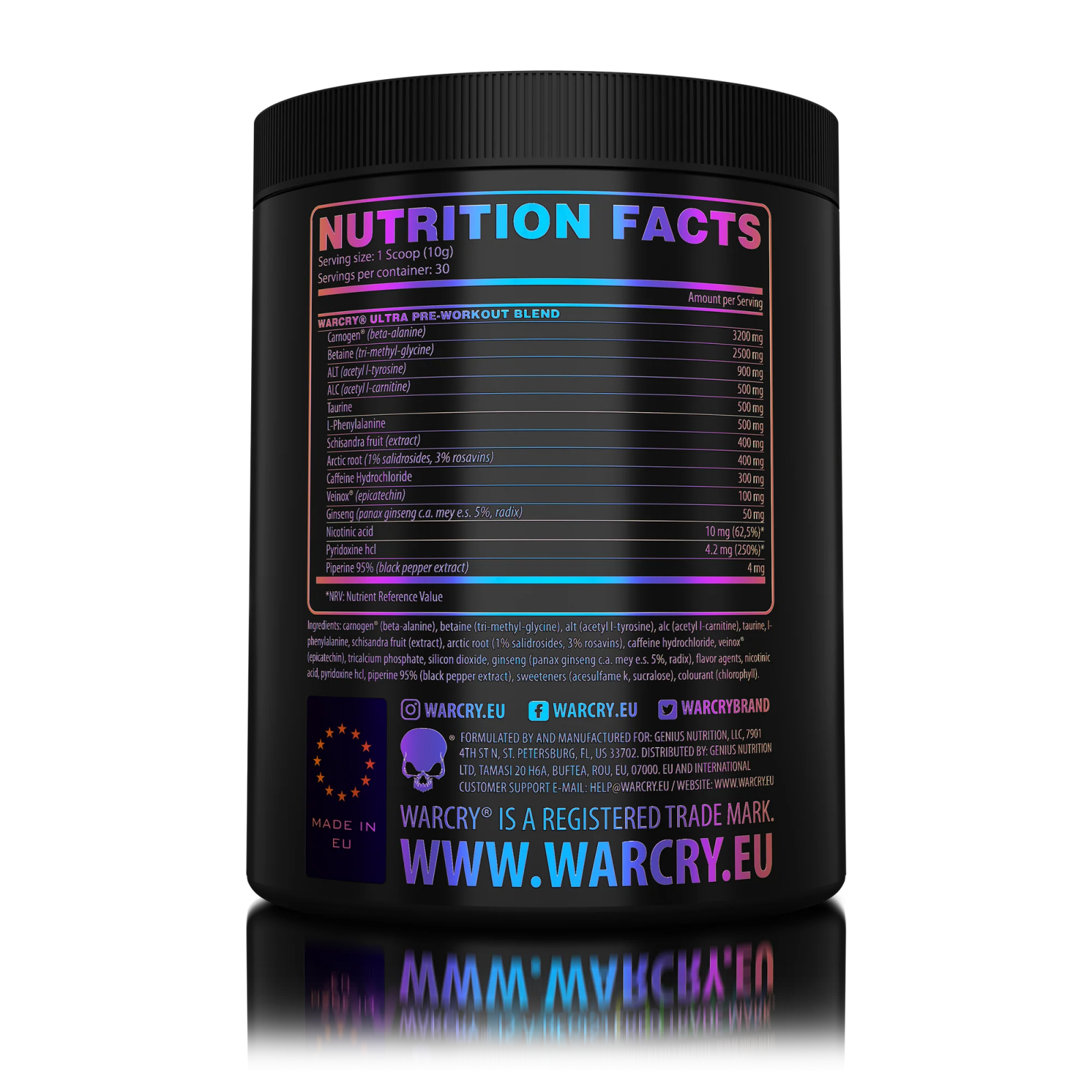 WARCRY ULTRA 300g/30serv este o simfonie a științei și creației, orchestrată într-un pre-workout care vă oferă toate ingredientele necesare pentru a vă transforma într-un zeu al performanței. Fiecare porție vă poartă într-o călătorie spre culmile înălțărilor fizice și mentale, în timp ce vă pregătiți să cuceriți sala de sport.