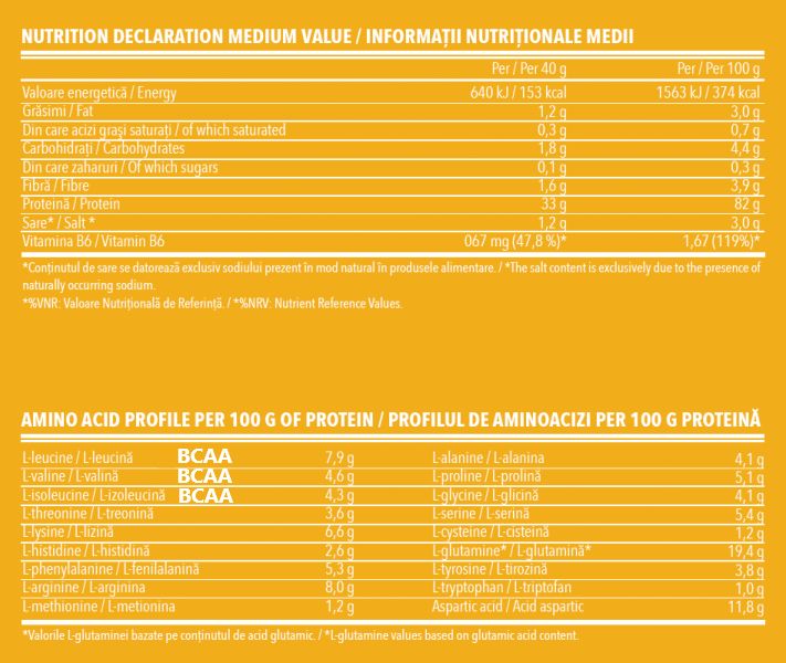 Ingrediente: Izolat proteic din soia, izolat proteic din mazăre, mix 5% (chlorella și spirulină), pulbere de cacao, aromă, îndulcitori (sucraloză și steviol glicozide) și vitamina B6 (clorhidrat de piridoxină).