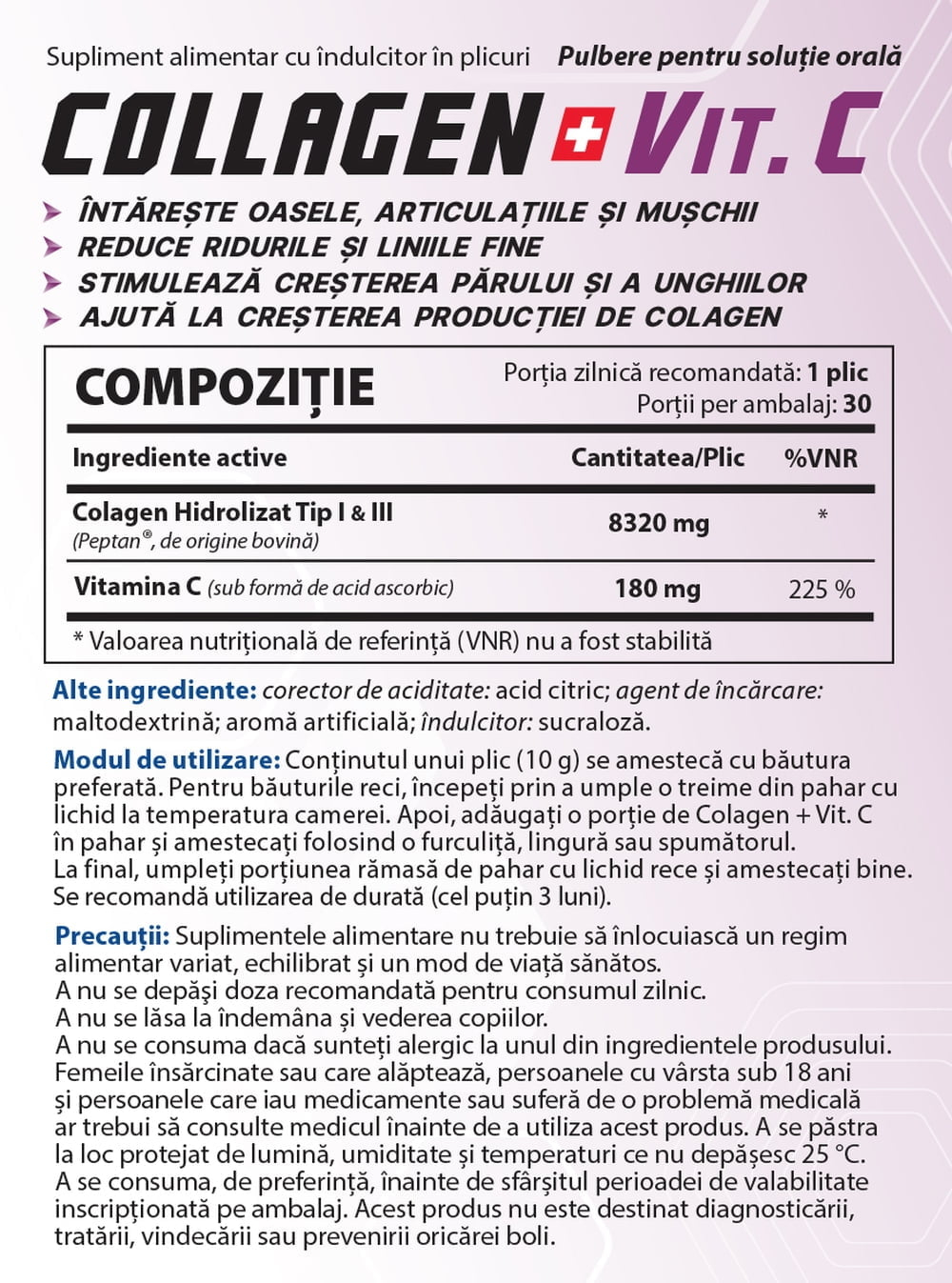 Balkan Pharmaceuticals Collagen + Vit. C este un supliment premium conceput pentru a susține sănătatea pielii, articulațiilor, părului și unghiilor, oferind o combinație eficientă de colagen și vitamina C. Colagenul contribuie la elasticitatea și fermitatea pielii, în timp ce vitamina C sprijină sinteza naturală a colagenului și protejează împotriva stresului oxidativ. Formula este ideală pentru persoanele care doresc o piele mai luminoasă, o structură articulară sănătoasă și o rutină simplă, dar completă, de îngrijire din interior.