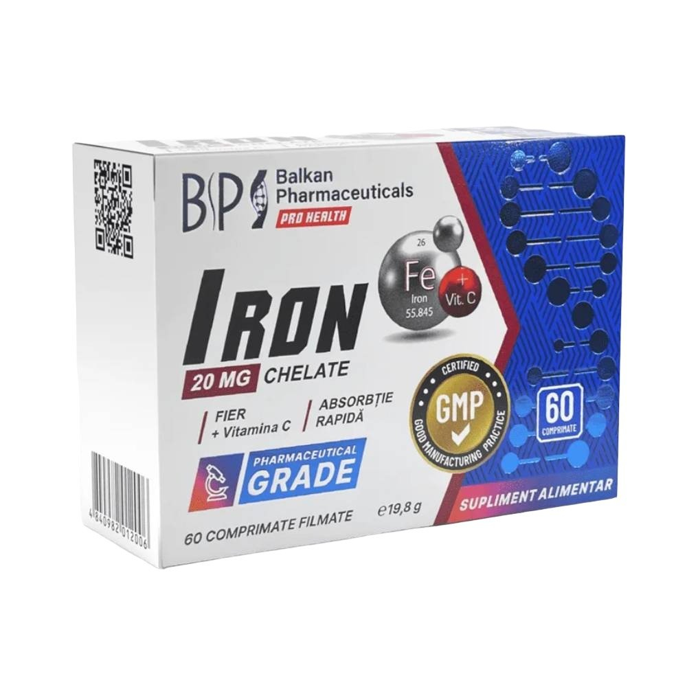 Balkan Pharmaceuticals Iron Chelate este un supliment alimentar sub forma de capsule pe baza de fier de inalta calitate, formulat pentru a furniza fier intr-o forma chelatata, cunoscuta pentru absorbtia superioara si biodisponibilitatea ridicata. Fierul chelat (bisglicinat feros) este legat de o molecula organica, un proces denumit chelare, care protejeaza fierul si ii faciliteaza absorbtia in organism.