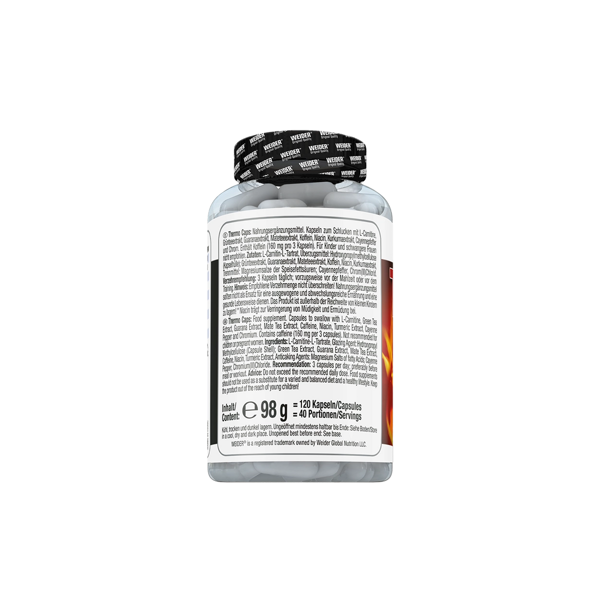 Weider Thermo Caps 120 capsule este un supliment termogenic avansat, creat pentru sportivii și persoanele active care urmăresc accelerarea metabolismului, arderea grăsimilor și creșterea nivelului de energie. Formula combină ingrediente eficiente într-un mix concentrat care susține definirea, intensifică termogeneza și optimizează performanța în timpul antrenamentelor.