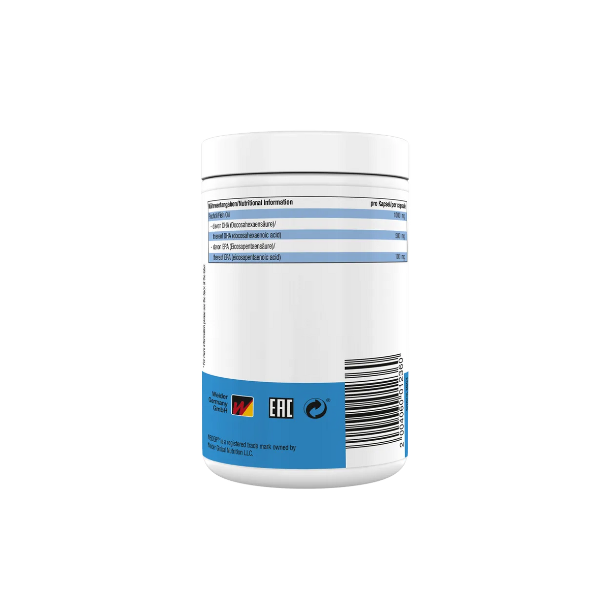 Capsulele cu ulei de pește Omega-3 Superior WEIDER conțin, per capsulă, un total de 1000 mg de ulei de pește de înaltă calitate, dintre care 500 mg sunt DHA și 100 mg EPA. Pentru o biodisponibilitate optimă, ne bazăm pe forma trigliceridelor (TG) și protejăm ulei valoros de la oxidarea nedorită cu vitamina E naturală.